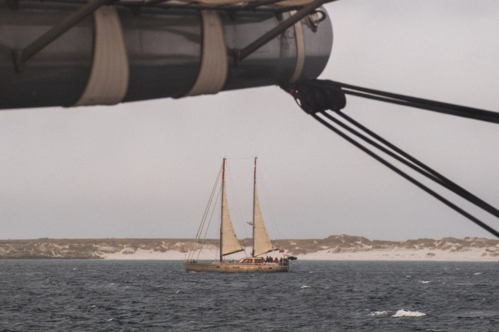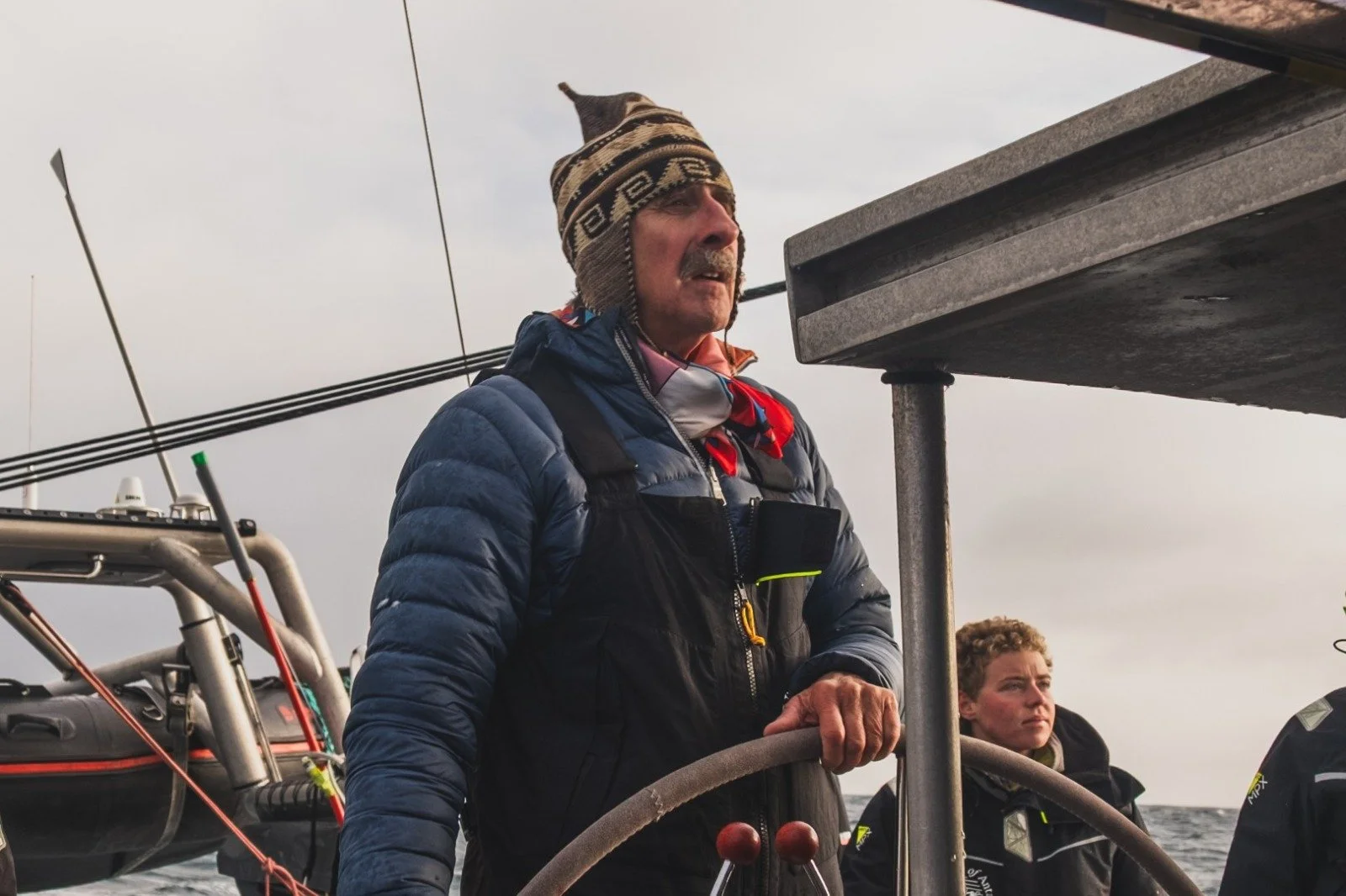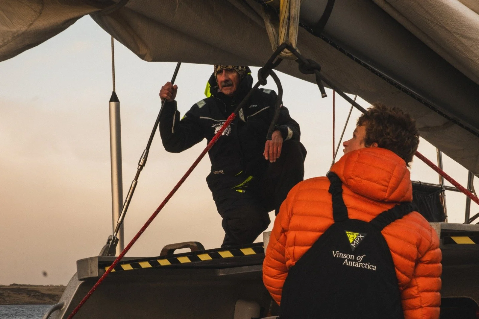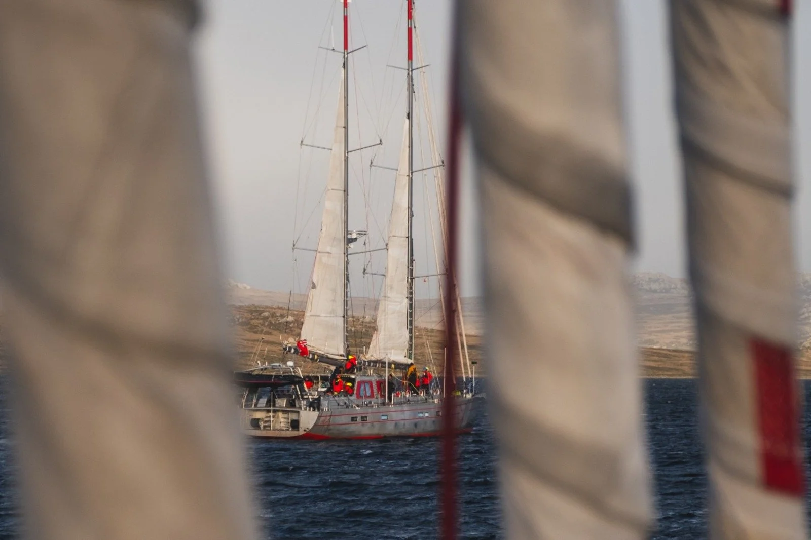 Monday night has caught us together. Amundsen and Vinson of Antarctica departed Port Stanley (Falkland Islands) this morning on a trip to take the ski-mountaineers to the snow line. With Skip Novak in command, the two vessels have lifted anchor and hoisted their sails next to each other, and now, after a whole day, Amundsen’s navigation lights are bright and only a few yards away from us. We are so close that Tor, Vinson’s skipper, is frequently checking if either of us should steer away from the other.