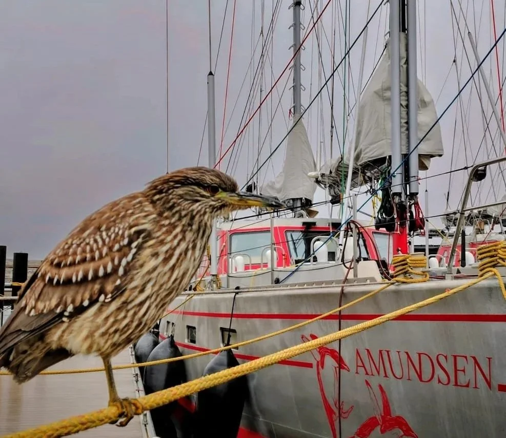 A juvenile Black-crowned Night Heron resting on the mooring line of the Amundsen, Stanley.