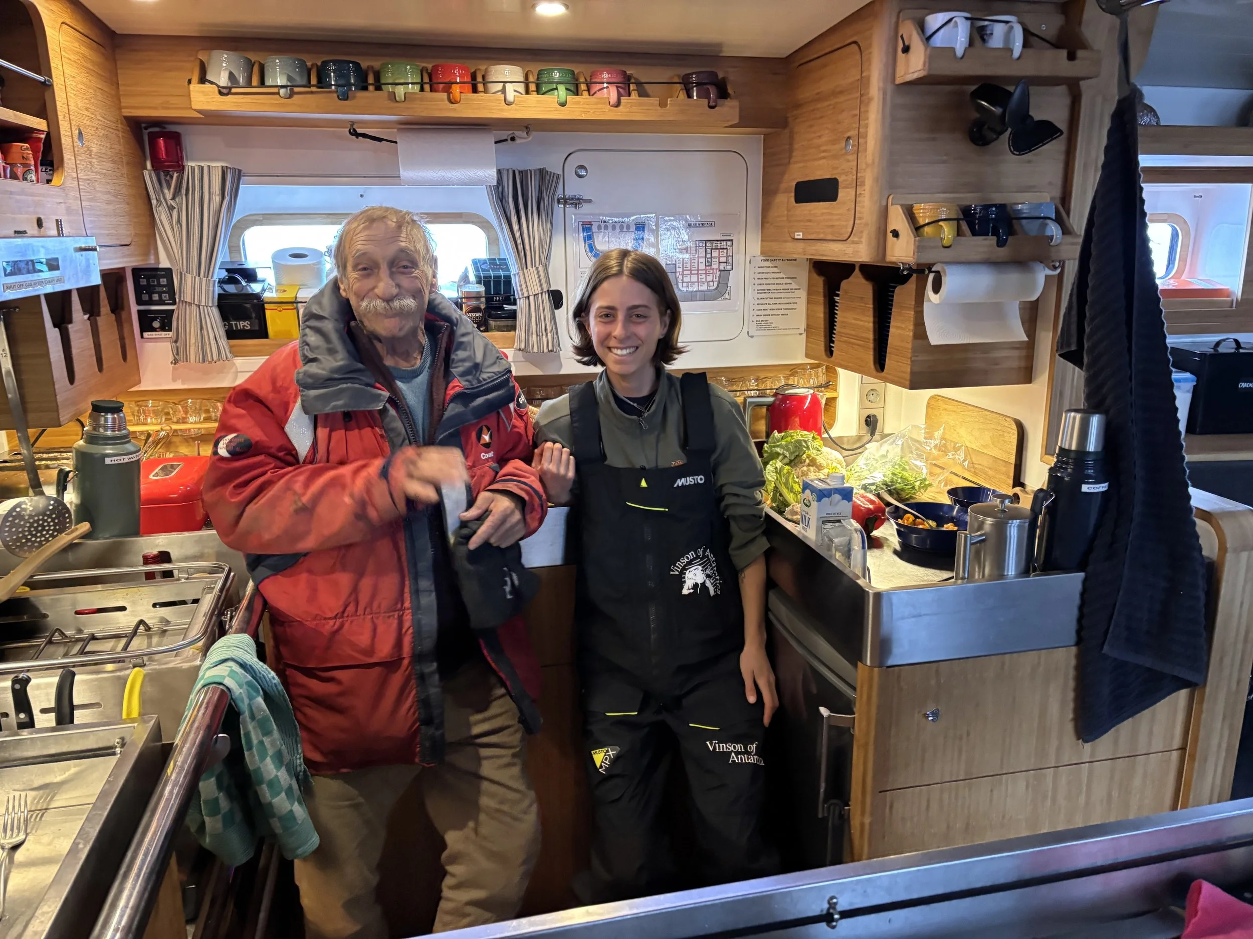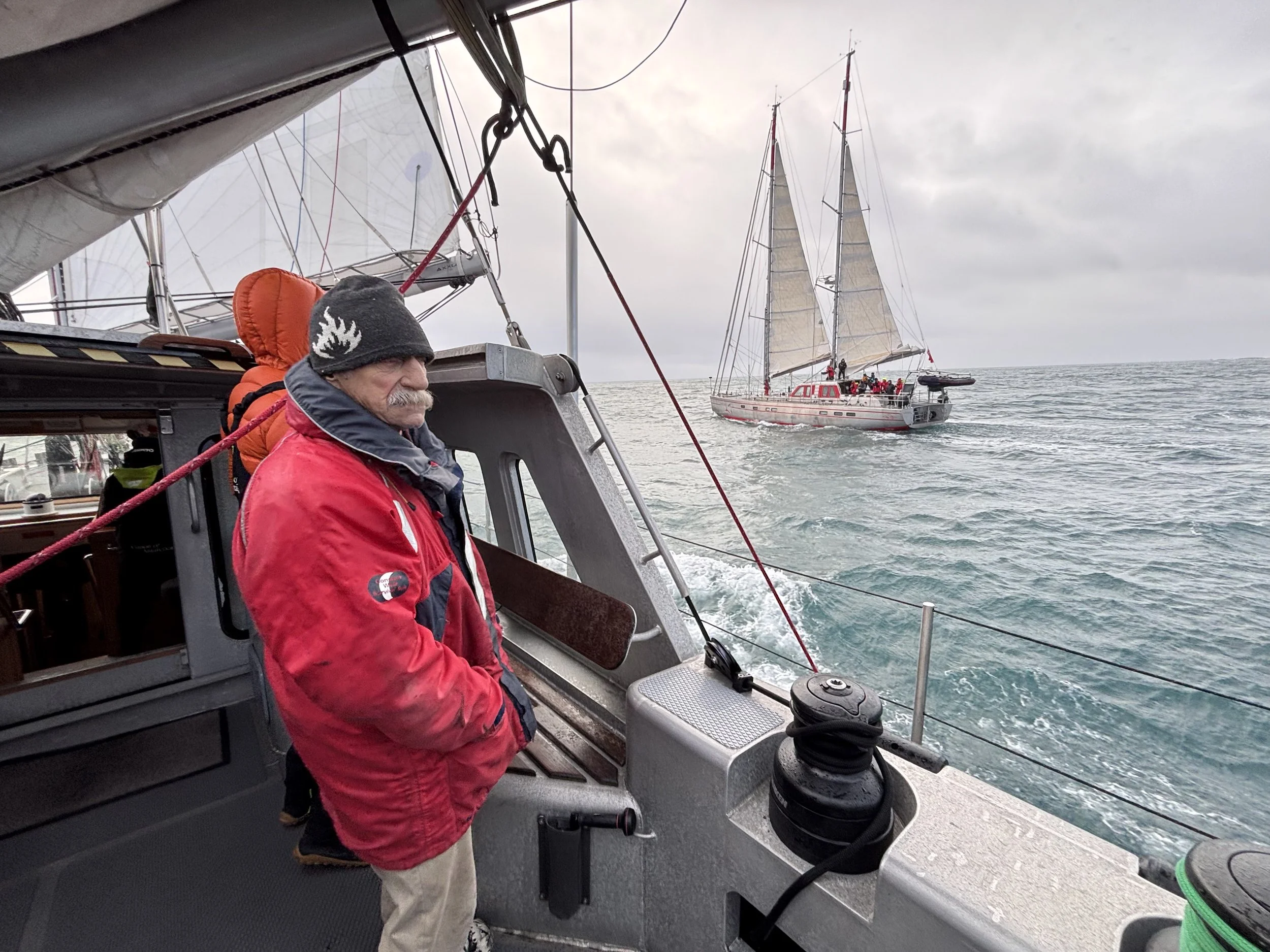To regress, when various people often refer to me quite wrongly as the most or at best ‘one of the most’ experienced Southern Ocean sailors, I immediately point out I am still a beginner – compared to Jerome, who first sailed around the world including the high north and the far south beginning in 1969 on his Damien I with his friend Gerard Janichon. From then the rest was history with Damien II committed to the south from 1975, wintering over in the Antarctic with wife Sally in 1978, and delivering his first child Dion in South Georgia on the salon table (yes, that’s right). Two more children followed and eventually this extraordinary family settled in the Falkland Islands and continued voyaging which was true exploration contributing to science and film making with their unparalleled (to this day) expertise – too many accomplishments to mention here, all of which is their legacy. In 2023 Jérôme celebrated his 50 years in the south with “a final voyage to South Georgia and the Antarctic Peninsula” on the Golden Fleece. By coincidence on Vinson we spent two days at anchor together in Larsen Harbour on the island during a storm. We were on the way to Zavodovsky Island in the South Sandwich chain, using the sporty landing on a sheer cliff to get ashore – the only safe landing there that Jerome had discovered decades ago.