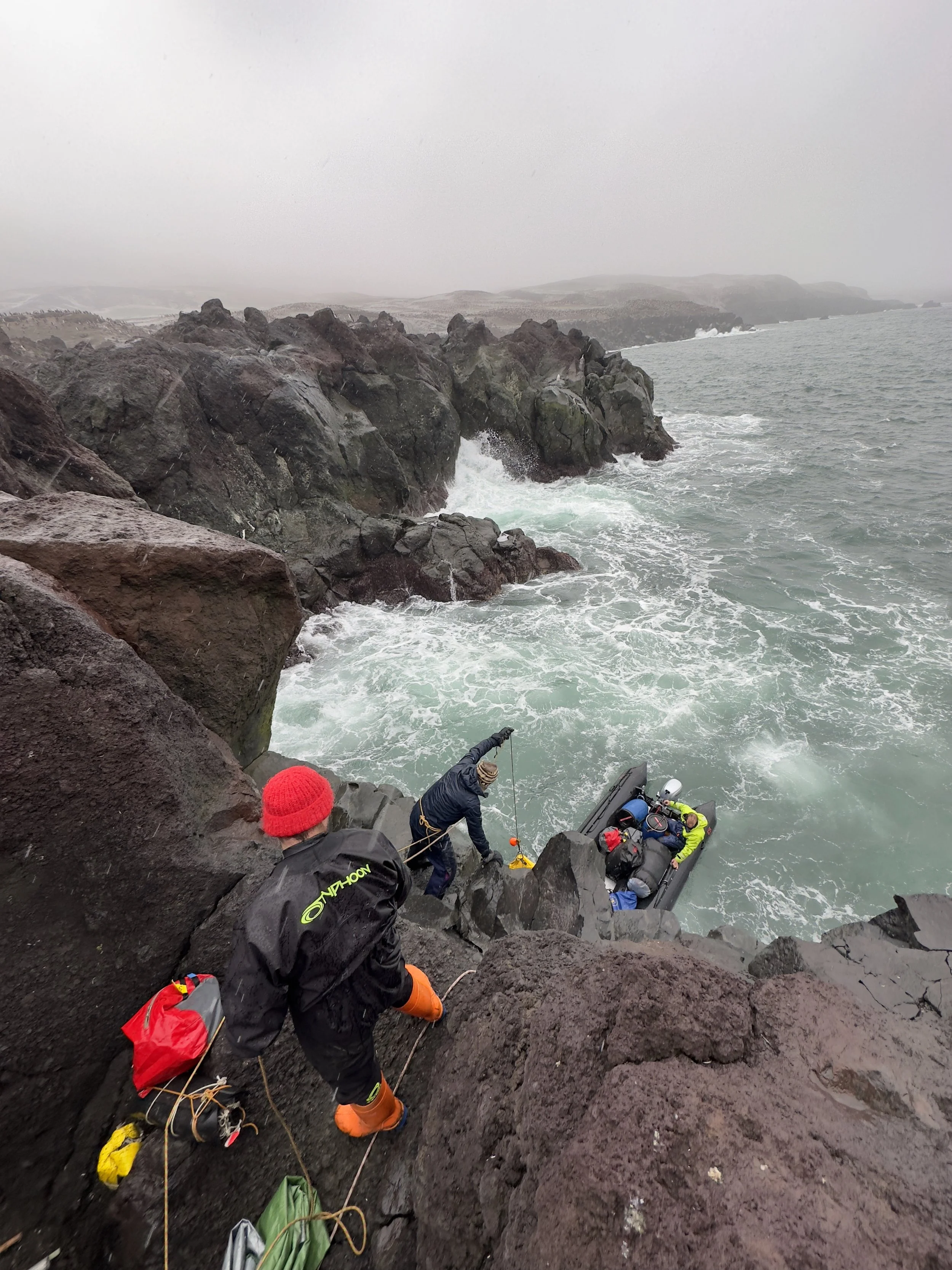 The whole team worked together like a well oiled machine. Justino and me unloading boxes from the big boat into the dinghy, Tor and Dion transferring the load from Vinson of Antarctica to the shore, where Skip and the shore team hauled up the boxes with climbing ropes and carried them to the chosen camp site.